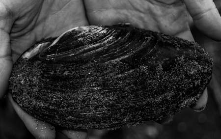lake shell on a child's hand, freshwater clam, aquatic inhabitants.