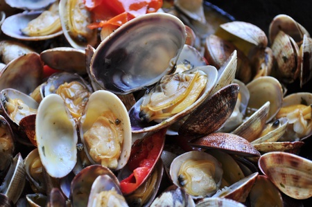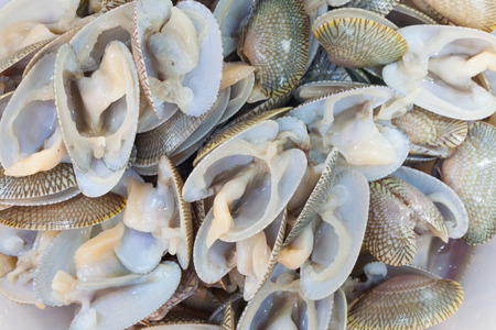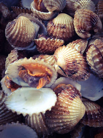 Delicious boiled or steamed cockles(Scallop seafood) food background or manu. shellfish smile. Small. Selective focus.