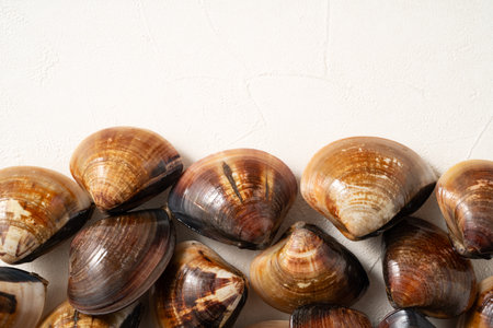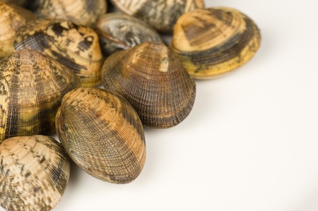 Fresh clams, raw cockles on a white table. Concept - Clean Monday, healthy food, aphrodisiac; Mediterranean Diet.