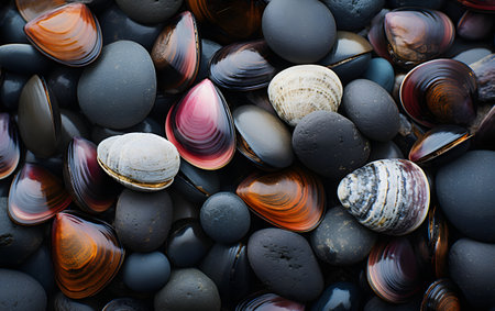 Colorful shells glisten with water droplets resting on a bed of smooth stones showcasing the beauty of nature in close up.