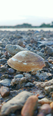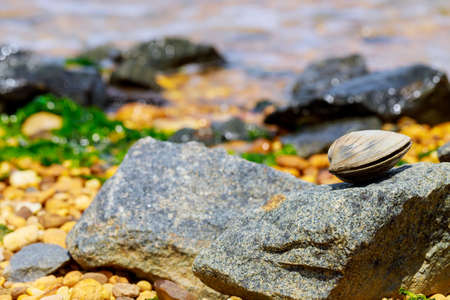 Clam lying on stone on the seashore. Sunny day. Soft focus.