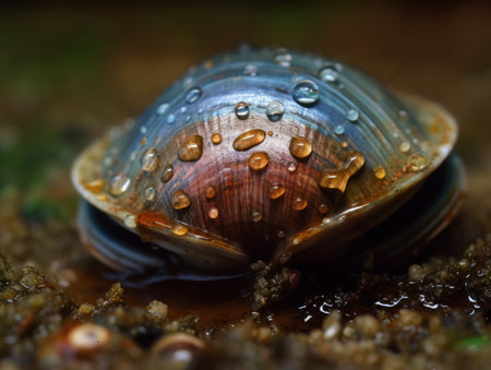 Close-up of a seashell with water droplets and bokeh effect, showing the intricate patterns and natural beauty of marine life.