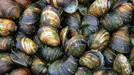 Close up View of Freshly Harvested Mussels Glistening in Sunlight Near the Ocean, Showcasing Marine Life and Fishing Techniques in a Coastal Setting. Generative AI