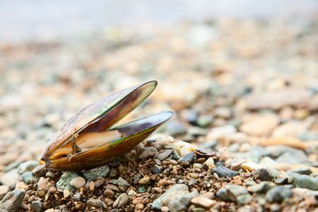Shell the mussels at the beach. Sandy bank of the Vistula. Environment unregulated river.