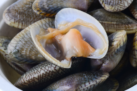 Alive hard clam in a tray for sell at local fish market in Phuket Thailand