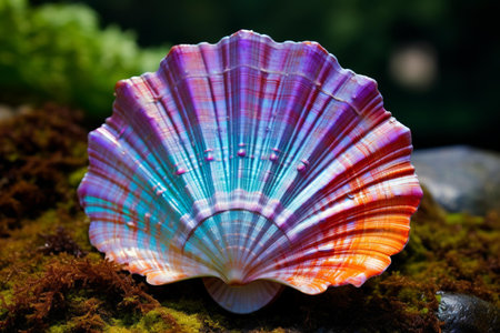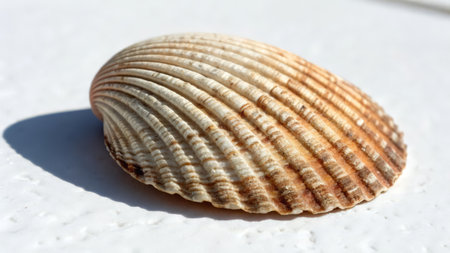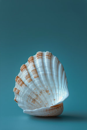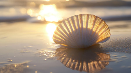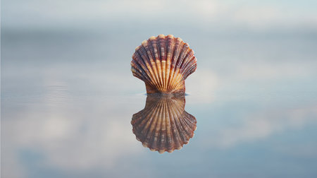 A stunning scallop shell rests on calm water, creating a beautiful reflection. This serene coastal scene captures the essence of nature