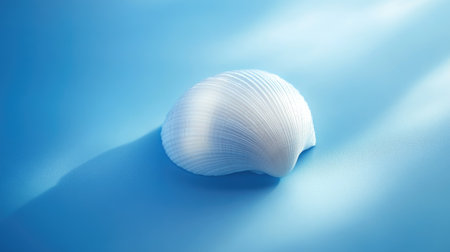 Bright blue background with a single white shell, centered and softly lit, casting a soft shadow