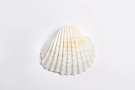 White sea shell, white background. Marine scallop from resort.