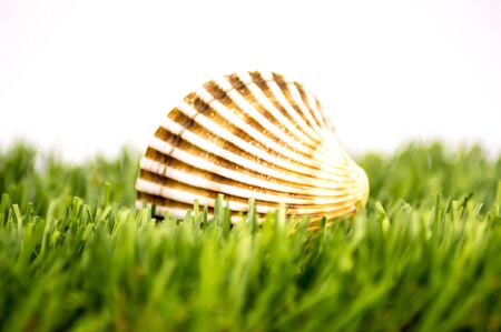 Sea shell on a green lawn and a white background