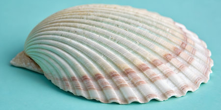 Close up macro shot of beautiful white common cockle seashell with intricate ridges resting on smooth blue studio background. Detailed shell texture and pattern closeup. Isolated bivalve mollusk on teal. Natural ocean treasure with concentric growth lines.
