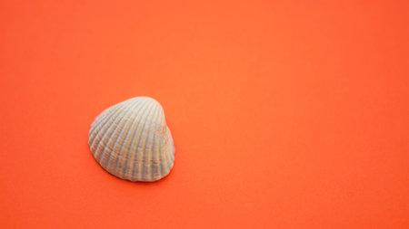 Gray seashell on a vivid orange table, copy space.