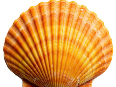 This image features a close-up of a scallop shell with a vibrant orange and yellow hue, isolated on a white background. The shell's intricate patterns and textures are clearly visible, making it the focal point of the image. The white background enhances the shell's colors and details, providing a clean and professional look suitable for various applications.