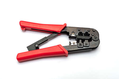 Electrical equipment. Electricity cable and crimper. Background