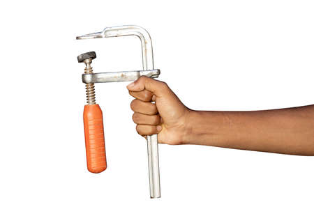 Clamp tool in male hand isolated on white