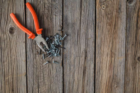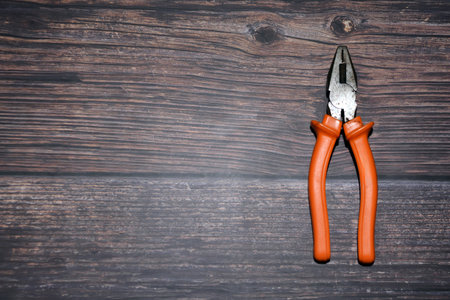 Pliers on a wooden background. Top view. Copy space.