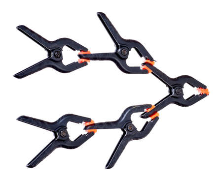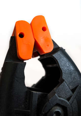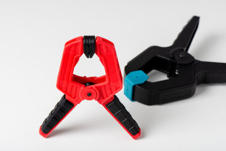 Plastic spring clamp isolated over white background. Equipment for woodworking, carpentry and other handiwork.