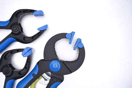 Carpentry plastic clamps with blue handles isolated on white background. Clamping tools for joinery and photography. Hand tools for handicraft. Top view.