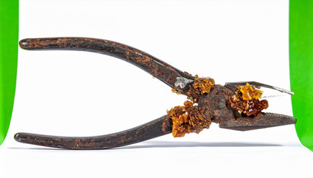 A pair of old, rusty pliers, long forgotten and abandoned, undergoes a beautiful and surreal transformation. Glistening amber-colored crystals sprout from its corroded joints, a testament to natures power to reclaim and create art from decay. This conceptual image represents the passage of time, entropy, and unexpected growth.