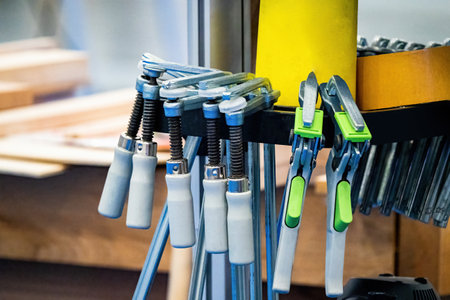 Lots of clamps in woodworking shop. Carpenter's tools. Mechanical devices for fastening boards. Clips for wood. Concept - sale of woodworking equipment. Mechanical devices for fastening elements