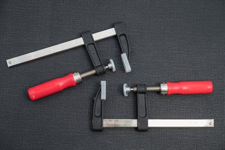 Pair of black clamp with orange plastic jawson on black textured carpenter's bench. Part of the workplace of a carpenter