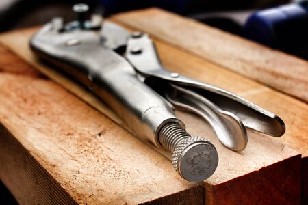 old metal locking pliers on wood background