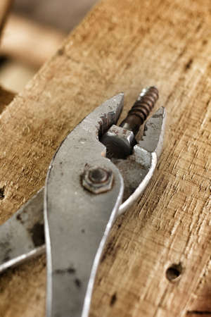Close-up of an old and rusty gripper or pliers over wooden table. High quality photo