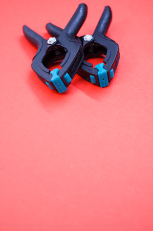 A vertical shot of two plastic spring clamp tools isolated on red background