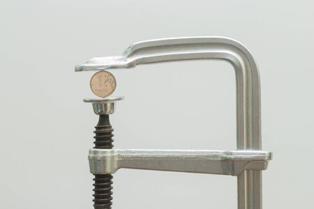 Coins squeezed in a carpenter's clamp. The image of the European currency in crisis. White background.