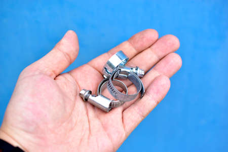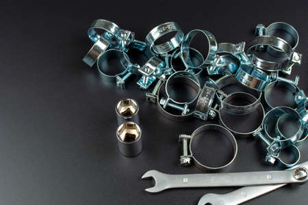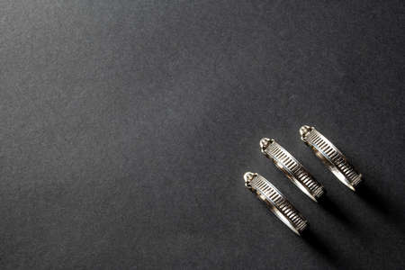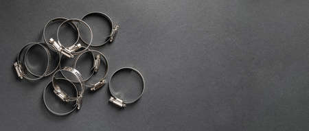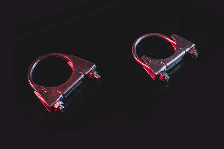 Two exhaust hose clamps isolated on black in modern red and blue dramatical lighting.