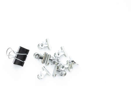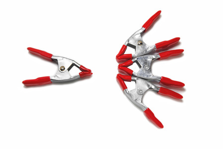 Close up of various sized colored red and blue metal clamps for fastening and holding various items during working and photo studio shooting on white background