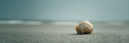 A solitary shell sits on the smooth sand, surrounded by gentle ocean waves and the peaceful atmosphere of an early morning by the sea.