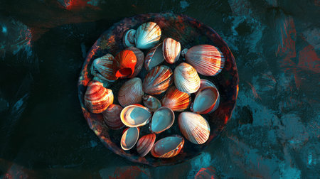 a shell underwater glistens with the reflection of sunlight, showcasing a mesmerizing blend of dark amber and pink hues. this photo captures photo-realistic landscapes with alchemical symbolism, presented in stunning 8k resolution. created by the talented artist jess meneses del barco, the shell is beautifully highlighted by rim light, adding a touch of light silver and red tones to the composition. ai generated