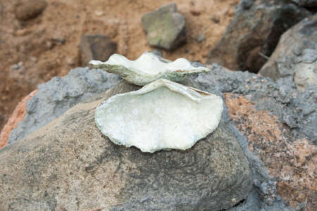 A closeup of a cockle on the beach surrounded by branches with a blurry background