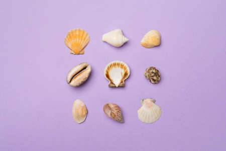 Summer beach background, seashells on light blue background. Top view. Sea summer vacation background