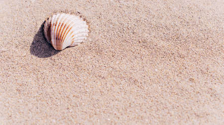 Seashell on sandy beach under sunlight, close-up macro. Natural coastal beauty concept.