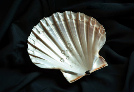 A detailed view of a large, white scallop shell with numerous water droplets clinging to its ribbed surface. The shell is placed on a dark, textured fabric.