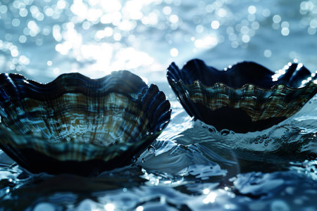 Close-up of a seashell with water droplets and bokeh effect, showing the intricate patterns and natural beauty of marine life.