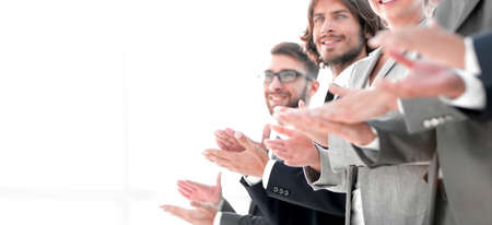 Applauding a masterful presentation. Closeup shot of a group of executives clapping while standing in a row in an office.
