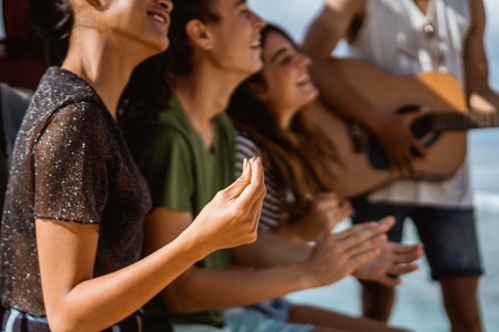 Friends clapping hands in circle close up, greeting, group meeting, grateful audience applauding thanking coach for presentation or seminar, successful team after accomplishing desired aim or result