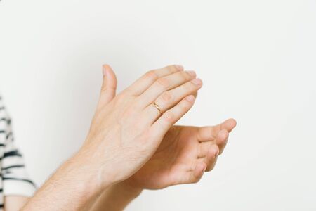 Man holding his hands together thank you sign hand gesture high angle view on a white background