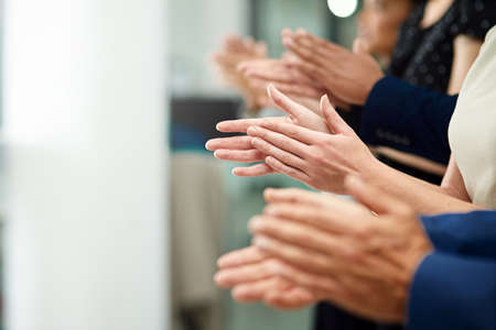 Business people clapping at meeting or conference, close-up of hands. Group of unknown businessmen and women in modern white office. Success teamwork, corporate coaching and applause concept