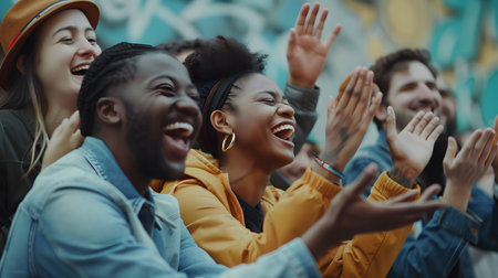 A group of diverse people excitedly clapping and laughing together at a public event.