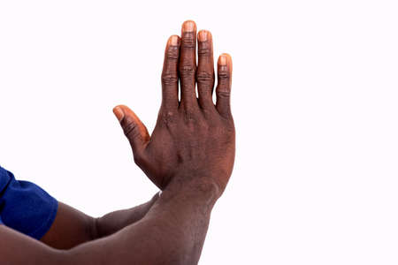 Close-up of hands of African-Ameican man raised against nature bavskground.