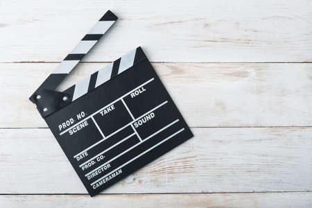 Classic black movie clapper board on white wooden background