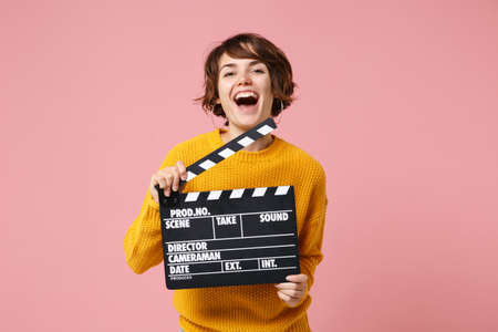 Laughing young brunette woman girl in yellow sweater posing isolated on pastel pink background in studio. People lifestyle concept. Mock up copy space. Holding classic black film making clapperboard.
