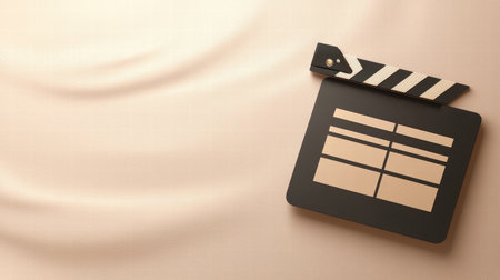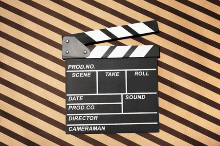 Movie clapper board on beige brown background. Filmmaking, Movie production, Entertainment industry. top view