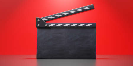 Movie clapper, blank empty cinema scene clapperboard on red background, copy space. Filmmaking, video production. 3d render