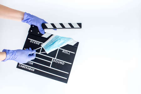 Clapperboard and film slate with the protective face mask. its uses in film, movies production, and the cinema industry. Impact of the movie industry from the COVID-19 pandemic.
