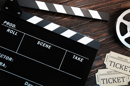movie clapper board or clapperboard at table background texture