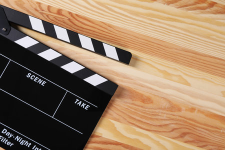 Movie production clapper board against wooden background with copy space